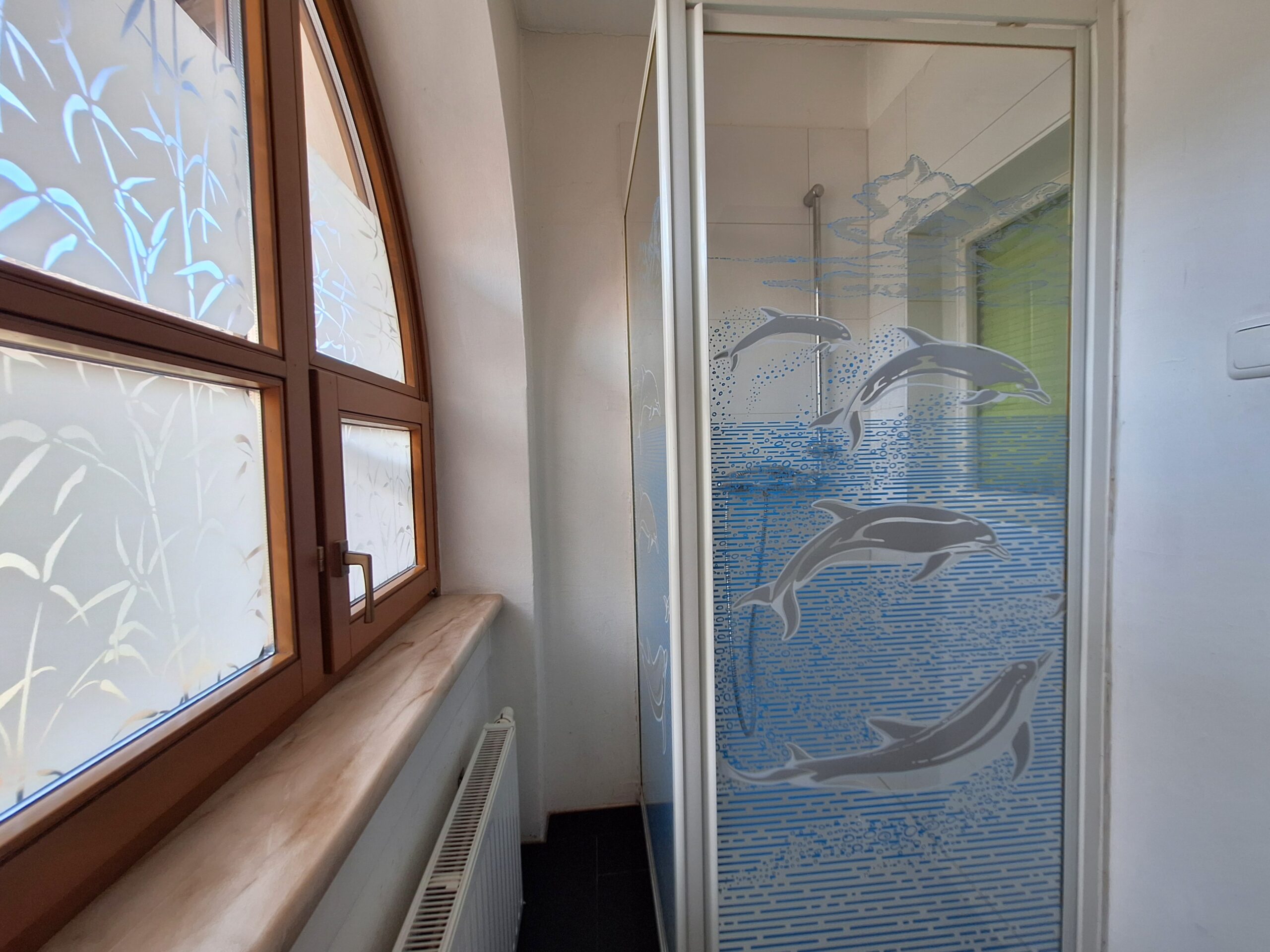 - Badezimmer mit Dusche, Waschmaschinenanschluss, Fenster und WC