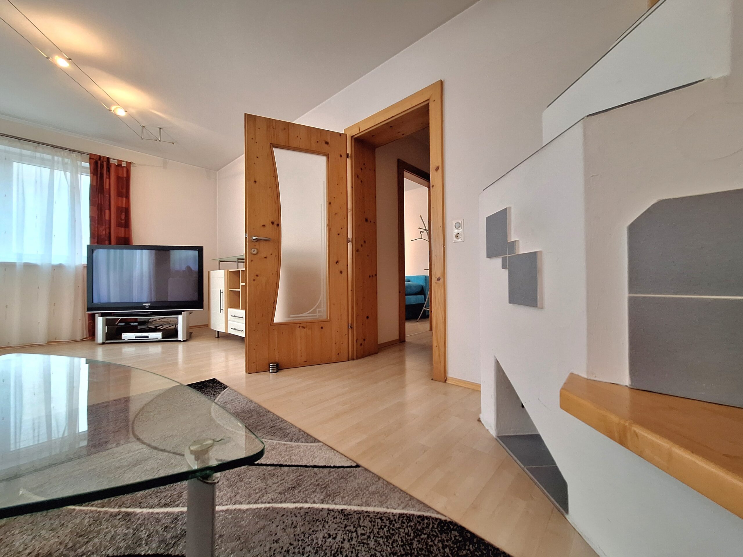 Wohnzimmer mit Kachelofen und Zugang zum Balkon