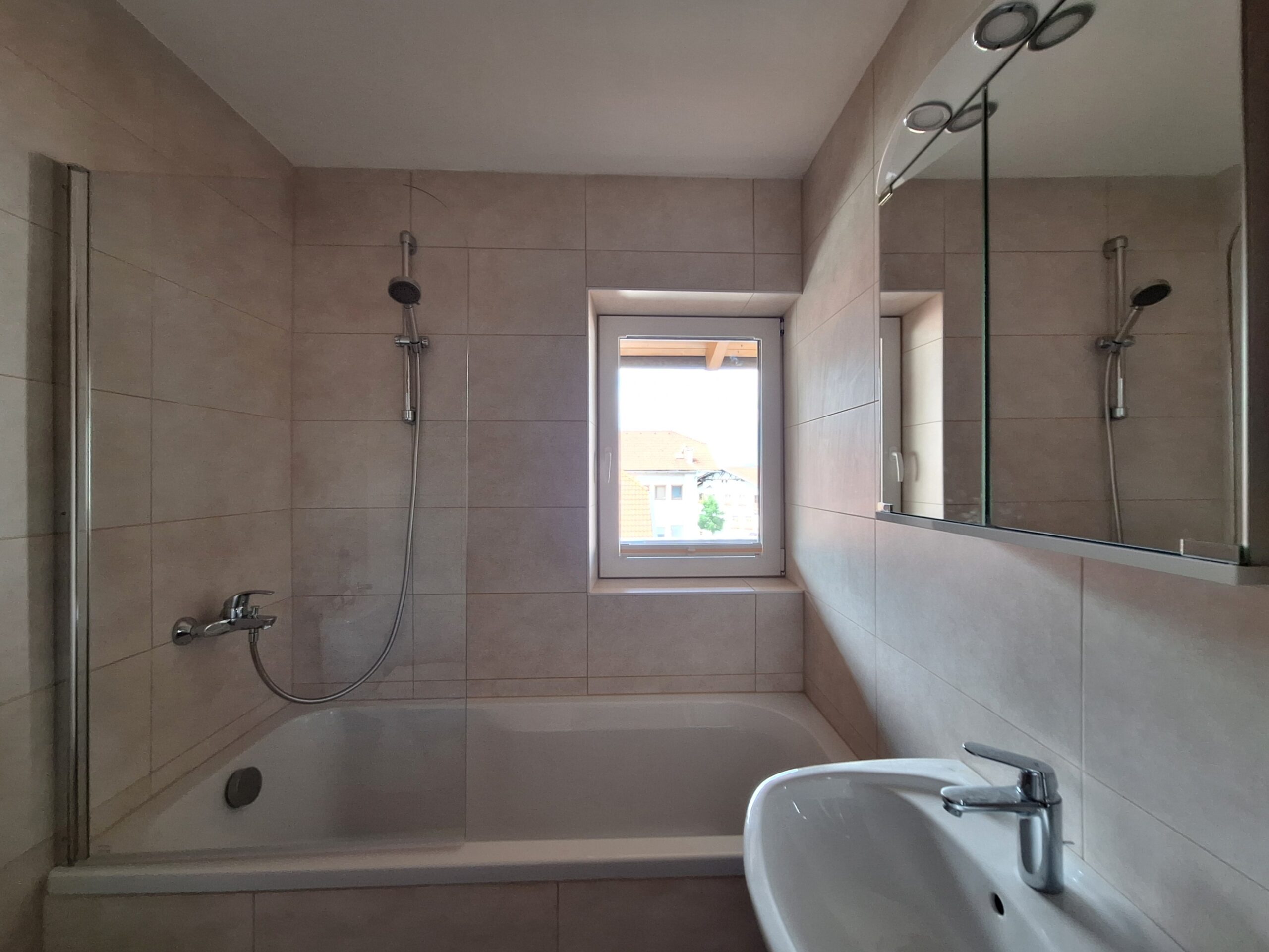 - Badezimmer mit Wanne, WC, Waschmaschinenanschluss und Fenster