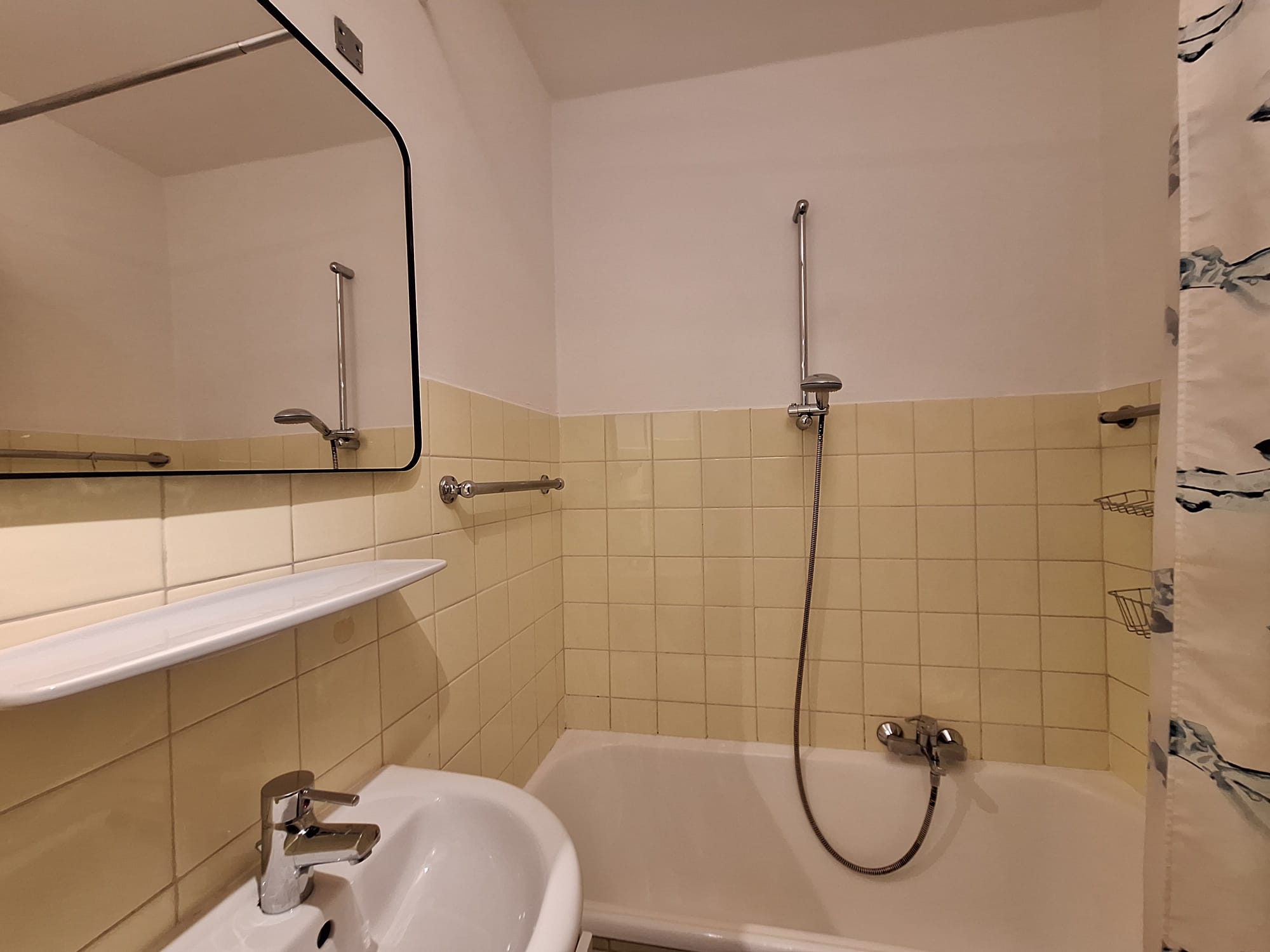 Die Wohnung teilt sich auf in einen kleinen Vorraum samt Einbauschrank, kleine Arbeitsküche, einem hellen Wohn-/Ess-/Schlafzimmer mit Zugang zum Ostbalkon, einem Badezimmer mit Wanne und WC.