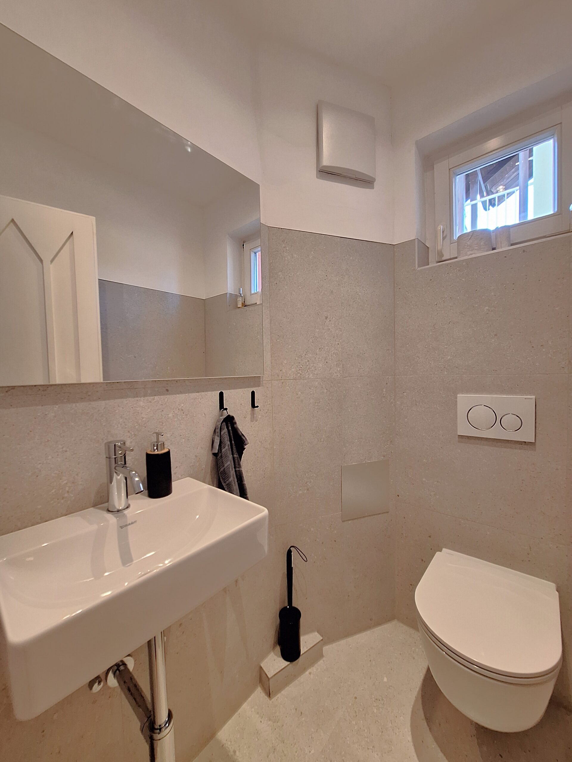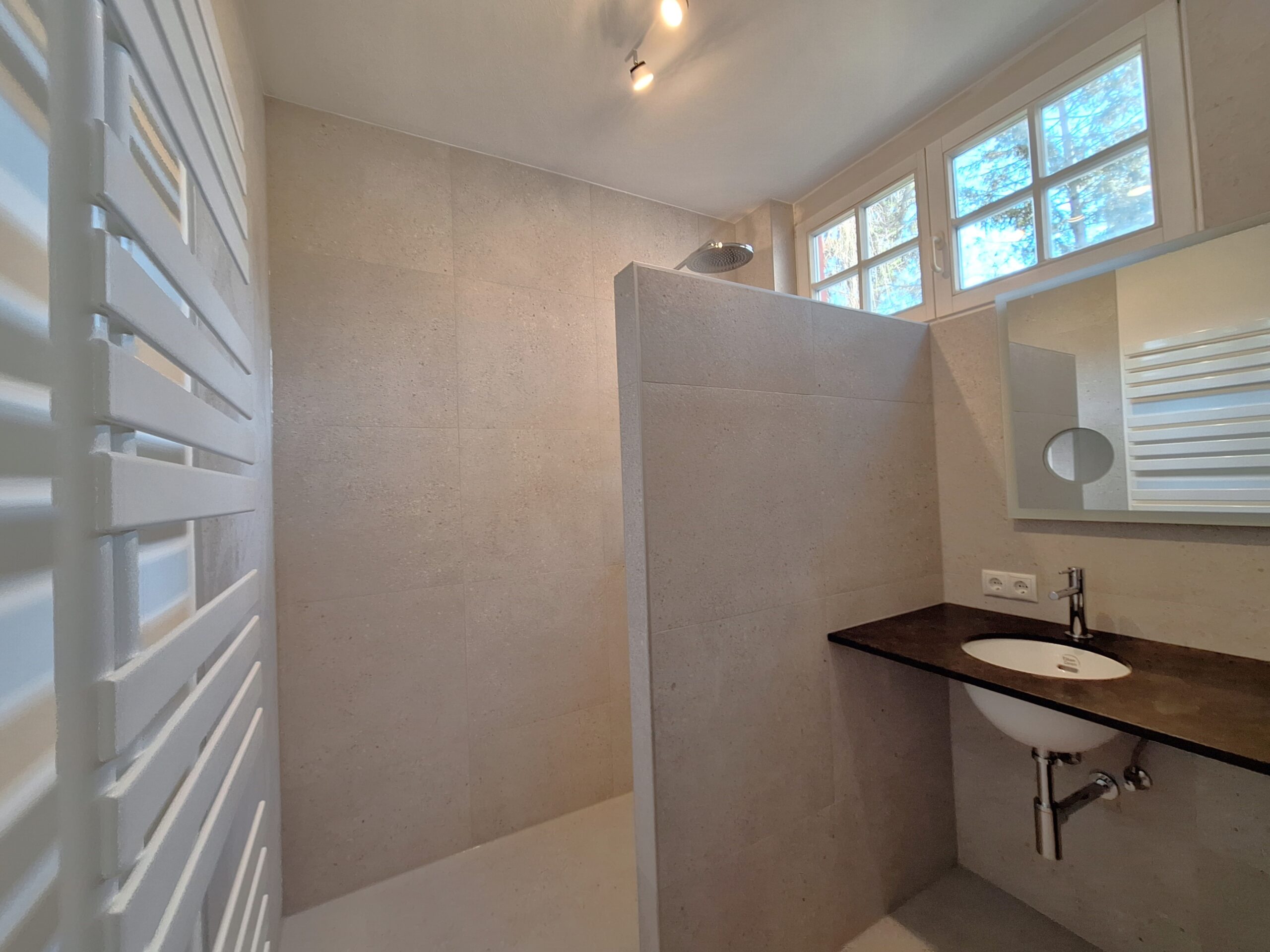 Bad mit Doppelwaschtisch, Dusche und Fenster